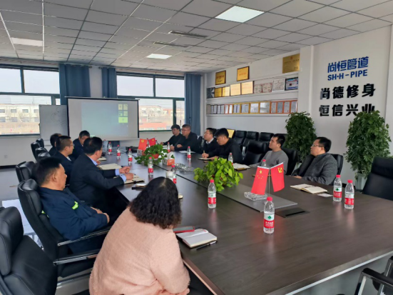 2023年3月7日上午,盐山管道装备制造产业科技特派团团长董国疆及盐山县科技工信和商务局卢桂敏副局长带队一行10人到尚恒管道公司进行技术交流,王光明总经理、刘铜总工等5人参加会议,刘铜总工对公司情况进行了介绍,提出了三通自动打坡口/自动焊接机器人、弯管内壁打磨机器人等技术需求,双方进行了技术交流探讨,特派团给出了相关技术案例和项目合作的建议及具体措施。同事,企业提出了在联合培养本科生和开展毕业设计等工作,以及对于焊接、热处理专业知识培训的相关事宜。最后,科技特派团到公司的弯管、焊接、机加、成品库等生产现场进一步讨论。